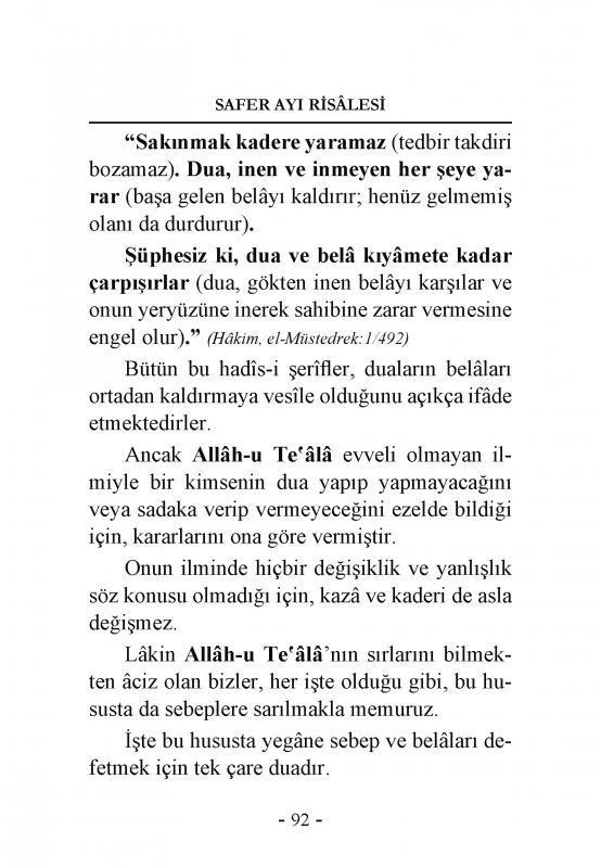 "Kazayı (Allah-u Teala'nın bir mesele hakkındaki takdirini) ancak dua geri çevirebilir. Ömrü de, ancak (anne-babaya ve muhtaçlarra) iyilik (yapmak) artırabilir." (Tirmizi, Kader:6, NO:2139; Müsnedü'l-Bezzar, no:2540, 1/392; Tahavi, Müşkillü'l-Asar no:2605.7/92)